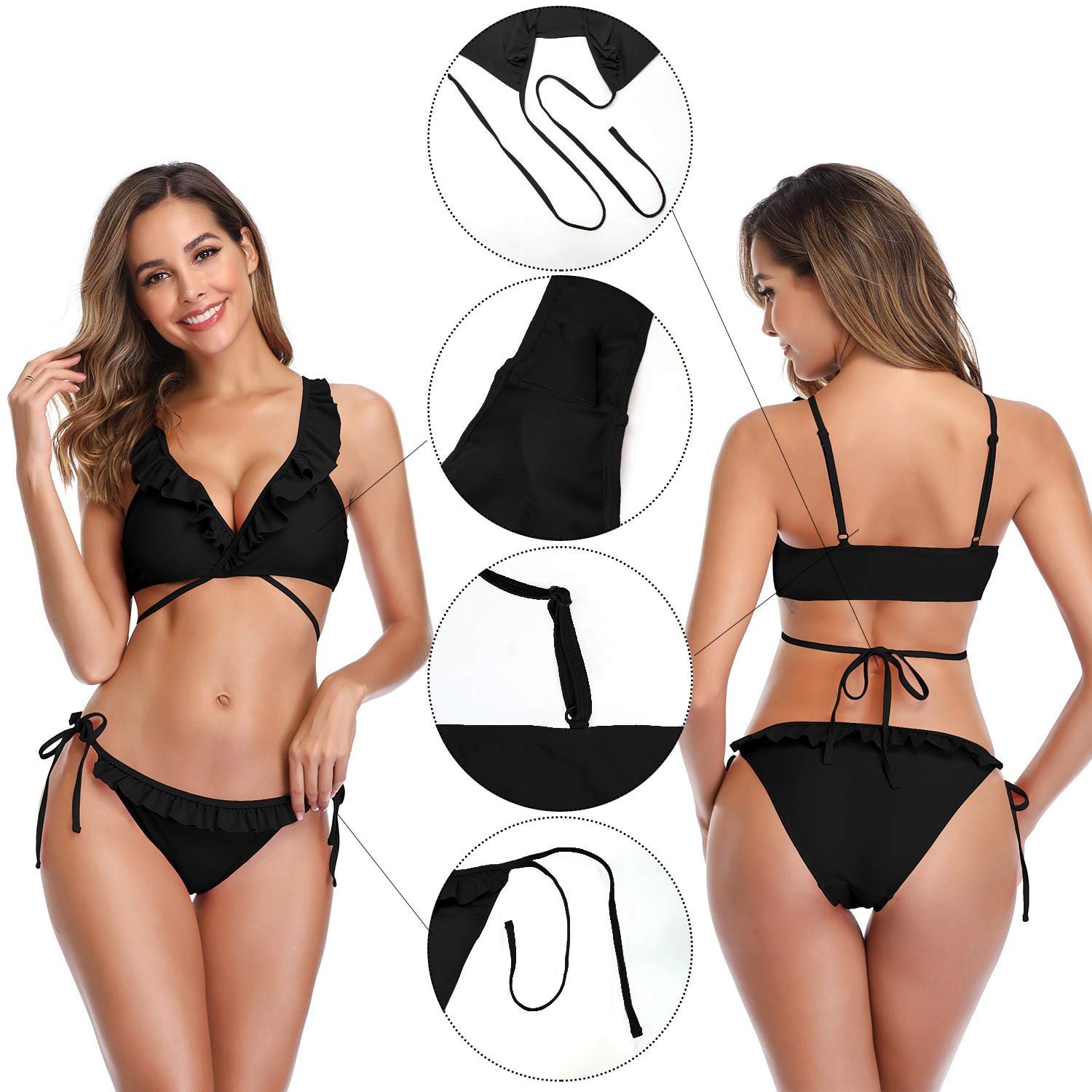 Free Size Color Black Fabric Microfiber Material Composition Plyester + Spandex Inner Lining No Inner Lining Pattern Solid Waist Band Rope Waist Rise Mid Waist Neck Type V Neck Closure Knot n Tie Coverage Full Cup Underwire Non Wire Sleeves Suitable for Women Occasion All Wash Care Gentle Hand wash in normal water Pack of 1 X Bikini Set Criss Cross Bikini –