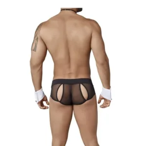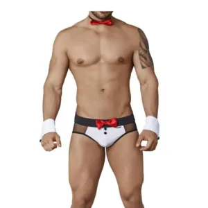 Men’s Roleplay Underwear is an erotic costume lingerie for men. This bedroom Roleplay Lingerie comes from high-quality Microfiber and Power Net which give, it a good elasticity and a super soft feeling. Men’s Underwear features Mesh sheer low-rise briefs shorts, with a red bow tie and buttons, with elastic bow tie press button cuffs.